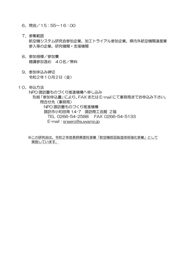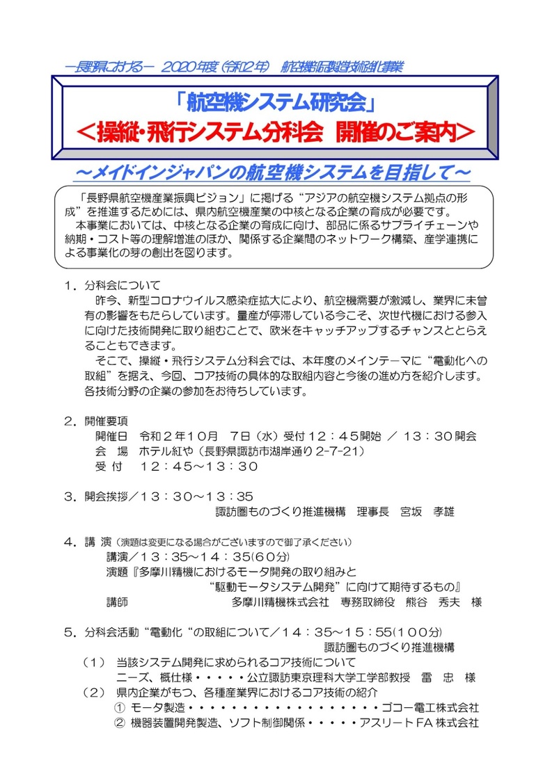 諏訪圏ものづくり推進機構より、航空機システム研究会開催のご案内です。