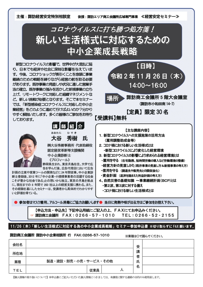 2020年11月10日(火) 新しい生活様式に対応するための中小企業成長戦略セミナーのご案内 下諏訪商工会議所より、経営安定セミナー参加者募集のご案内です。 【申込・問合せ先】 諏訪商工会議所 TEL:0266-57-1010 FAX:0266-52-2155