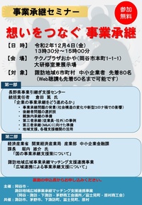 事業承継問題の現状と課題について理解を深めていただくため、諏訪地域6市町村の中小企業の皆様を対象に、事業承継セミナー「想いをつなぐ 事業承継」を開催いたします。参加を希望される場合は、下記により事前にお申し込みください。
