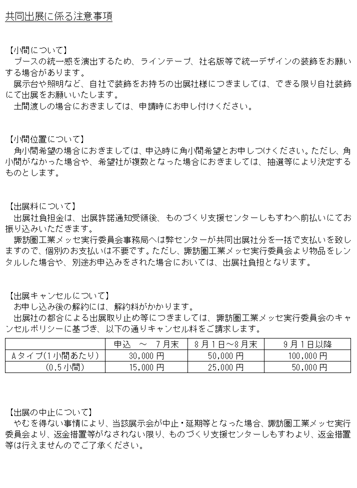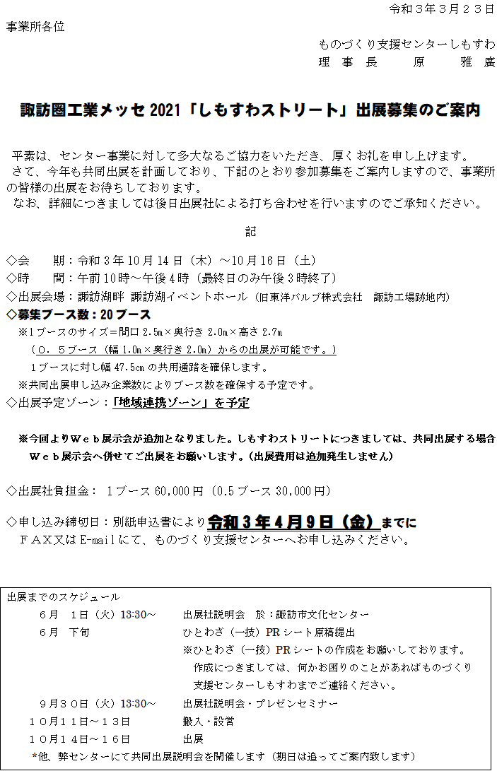 2021年03月23日(火) 諏訪圏工業メッセ2021「しもすわストリート」出展募集のご案内 諏訪圏工業メッセ2021「しもすわストリート」出展募集のご案内です。 申込書 上記 申込書に、必要事項を入力の上FAX・メールまたは直接センターへお申込みください。