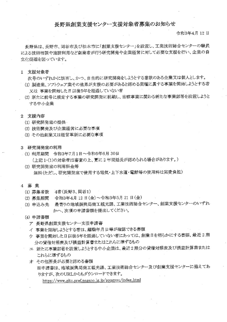 長野県創業支援センターより、支援センター対象者募集のご案内です。