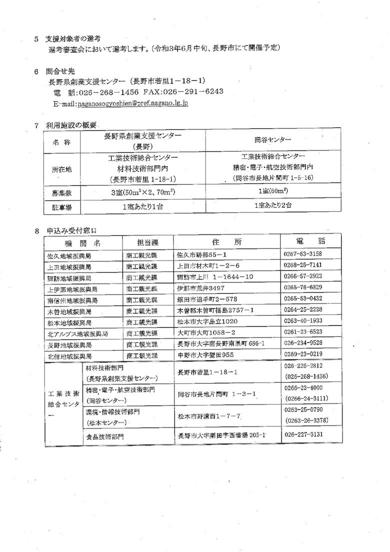 長野県は、長野市・岡谷市・松本市に「創業支援センター」を設置し、工業技術総合センターの職員による技術相談や施設利用など創業者が行なう研究開発や企業経営に対して必要な支援を行ない、企業の自立化促進を図っています。