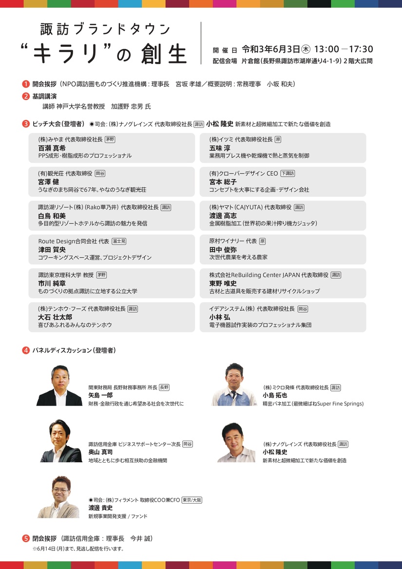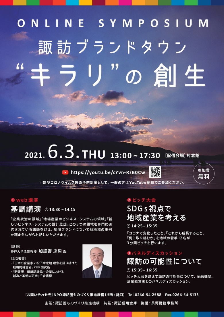 2021年05月27日(木) 「諏訪ブランドタウン”キラリ”の創生」聴講者募集のご案内 諏訪圏ものづくり推進機構より、オンラインシンポジウム「諏訪ブランドタウン”キラリ”の創生」聴講者募集のご案内です。 申込み・詳しい内容につきましては諏訪圏ものづくり推進機構へお問合せください。