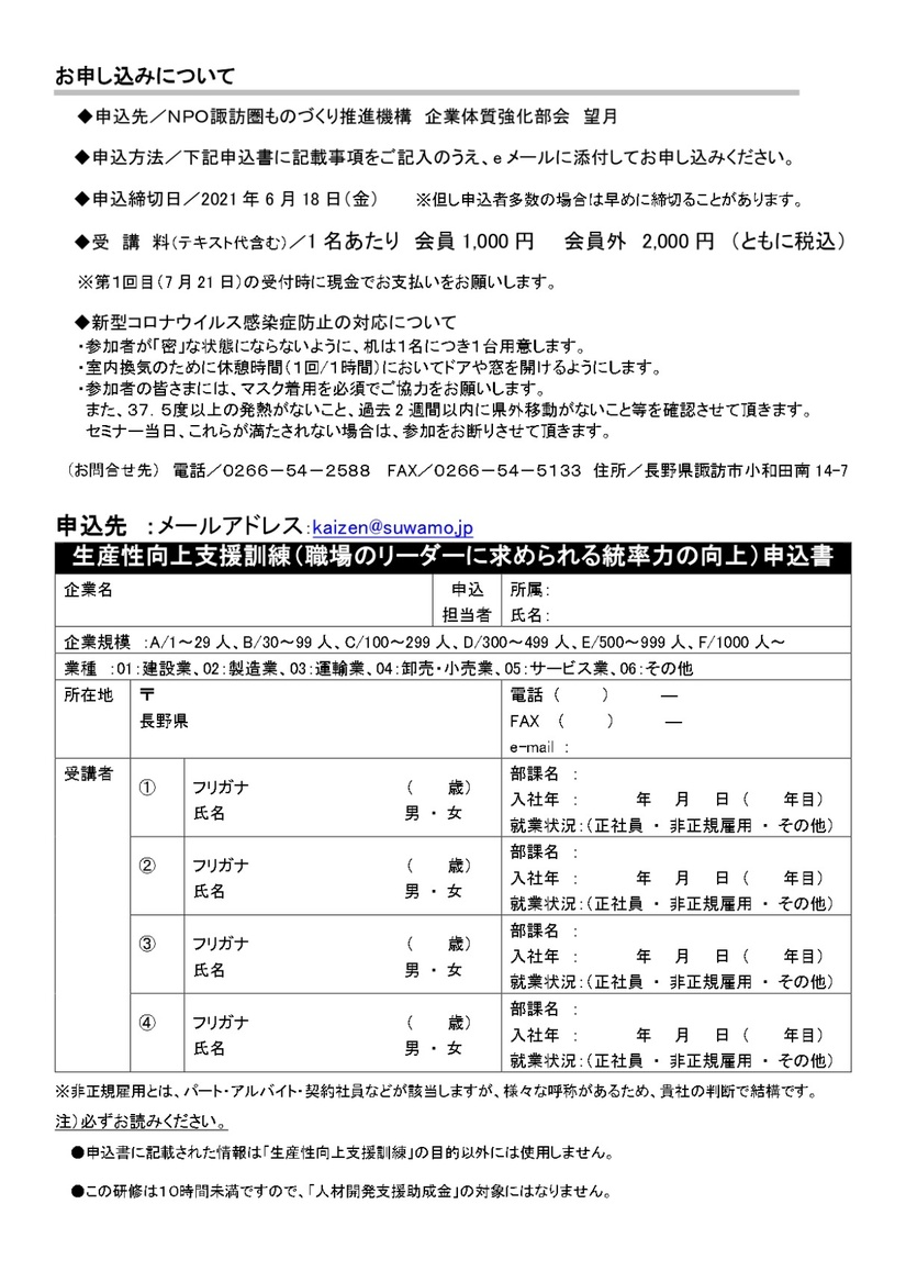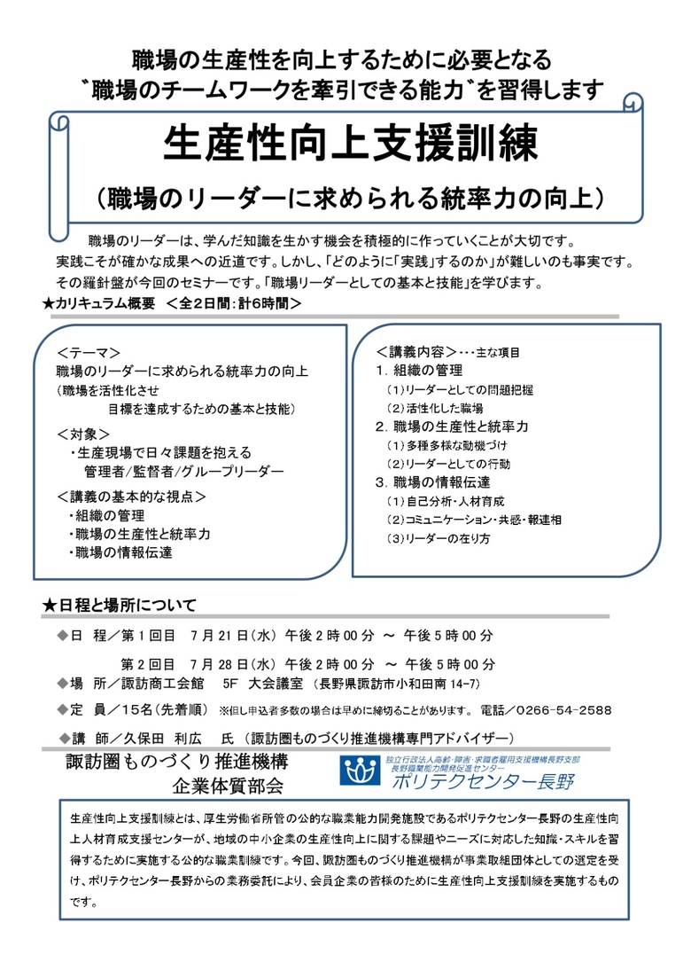 諏訪圏ものづくり推進機構企業体質部会より、「生産性向上支援訓練」受講者募集のご案内です。