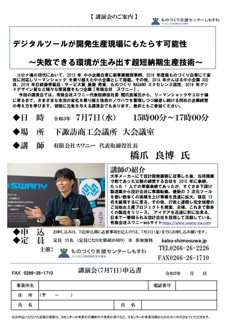 2021年06月22日(火) ものづくり支援センターしもすわ特別講演会のご案内 ものづくり支援センターしもすわ主催特別講演会「デジタルツールが開発生産現場にもたらす可能性」 参加募集のご案内です。 お問合せよりお申込ください