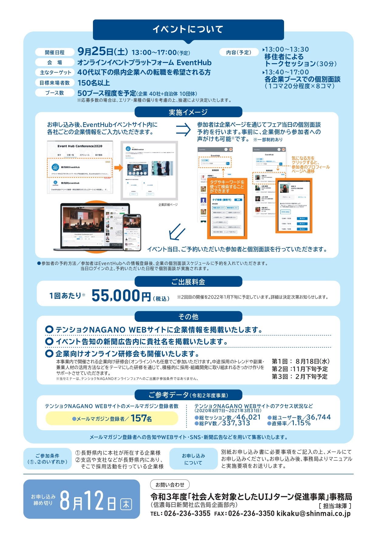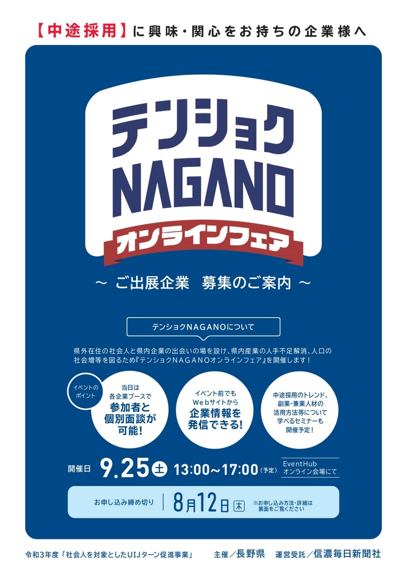 2021年07月14日(水) テンショクnaganoオンラインフェア出展企業募集のご案内 長野県産業労働部・企画振興部より、「テンショクnaganoオンラインフェア」出展企業募集のご案内です。 詳しくはこちらへ