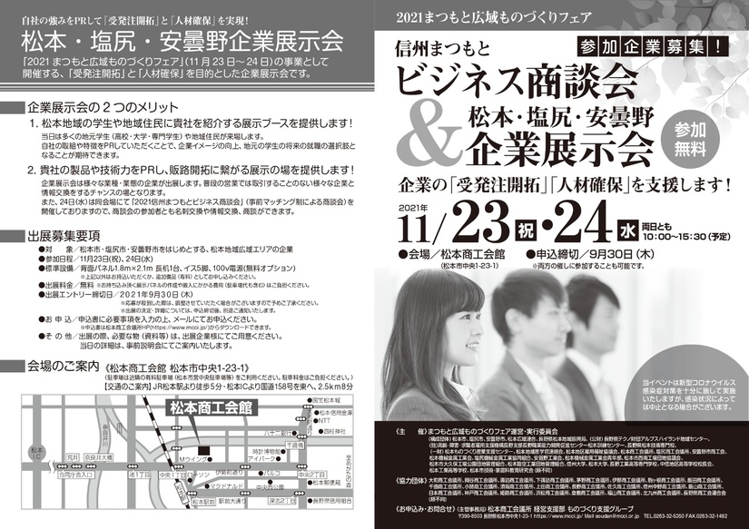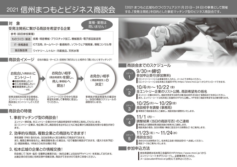2021年07月30日(金) 信州まつもとビジネス商談会参加企業募集のご案内 まつもと広域ものづくりフェア運営・実行委員会より、「信州まつもとビジネス商談会」参加企業募集のご案内です。 詳しくはこちらへ