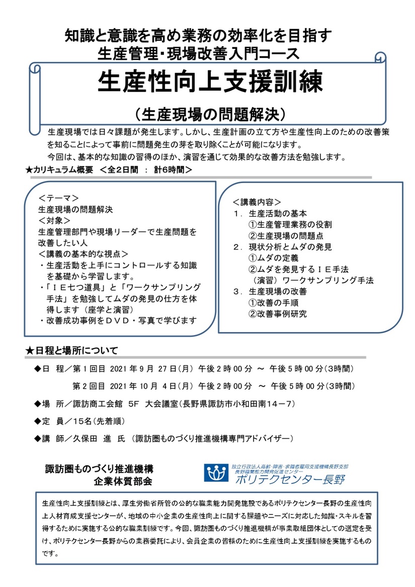 諏訪圏ものづくり推進機構より、生産性向上支援「生産現場の問題解説のご案内です。