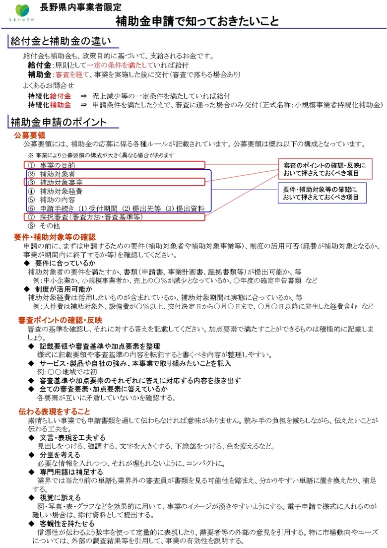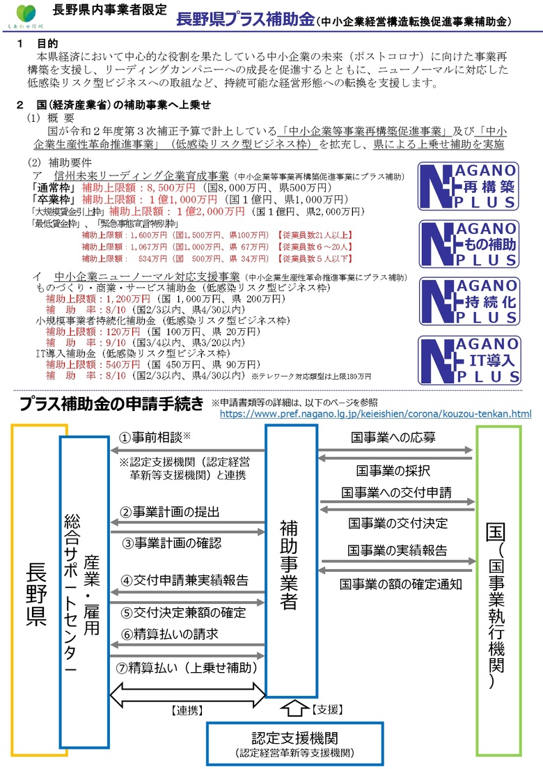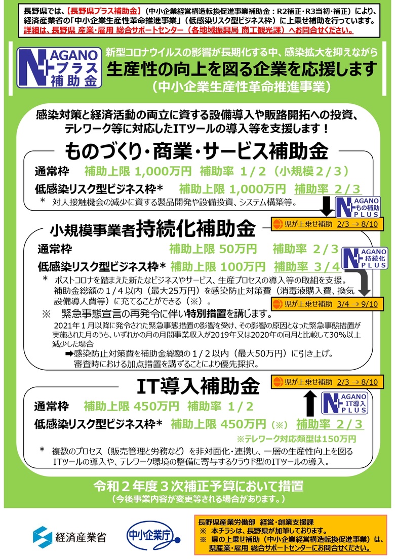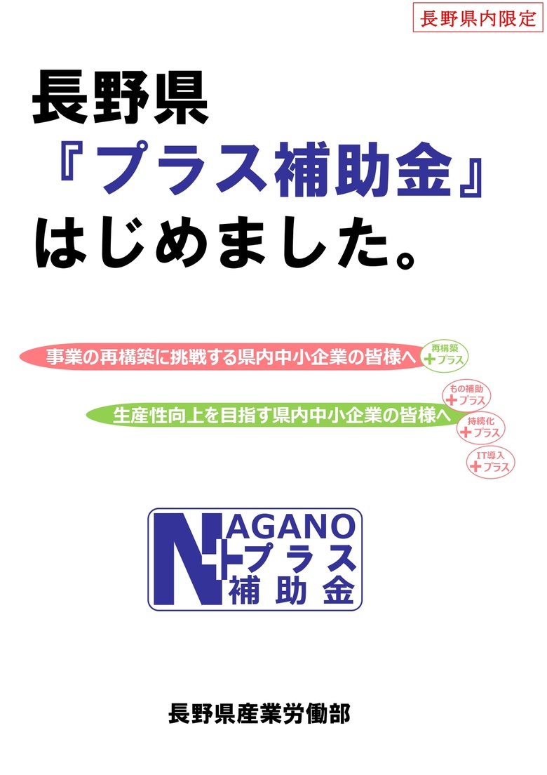 長野県産業労働部より、長野県プラス補助金拡充のご案内です。
