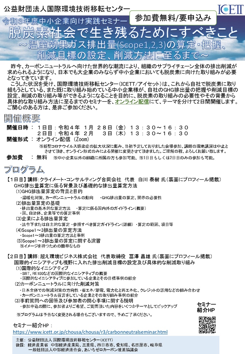 公益財団法人 国際環境技術移転センター(ICETT/アイセット)より、令和3年度中小企業向け実践セミナー「脱炭素社会で生き残るためにすべきこと」~温室効果ガス排出量(Scope1,2,3)の算定・把握、削減目標の設定、削減方法に至るまで~オンライン参加者募集のご案内です。