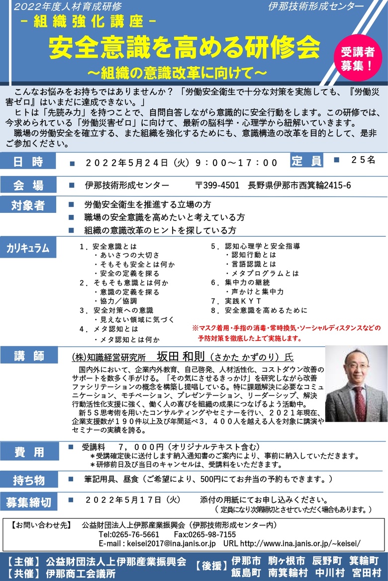 伊那技術形成センターより。組織強化講座「安全意識を高める研修会」受講者募集のご案内です。