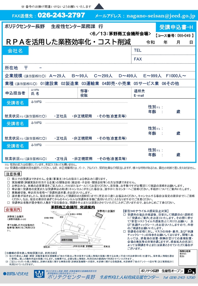2022年05月10日(火) 生産性向上支援訓練「RPAを活用した業務効率化・コスト削減」受講者募集のご案内 下諏訪商工会議所より、生産性向上支援訓練「RPAを活用した業務効率化・コスト削減」受講者募集のご案内です。