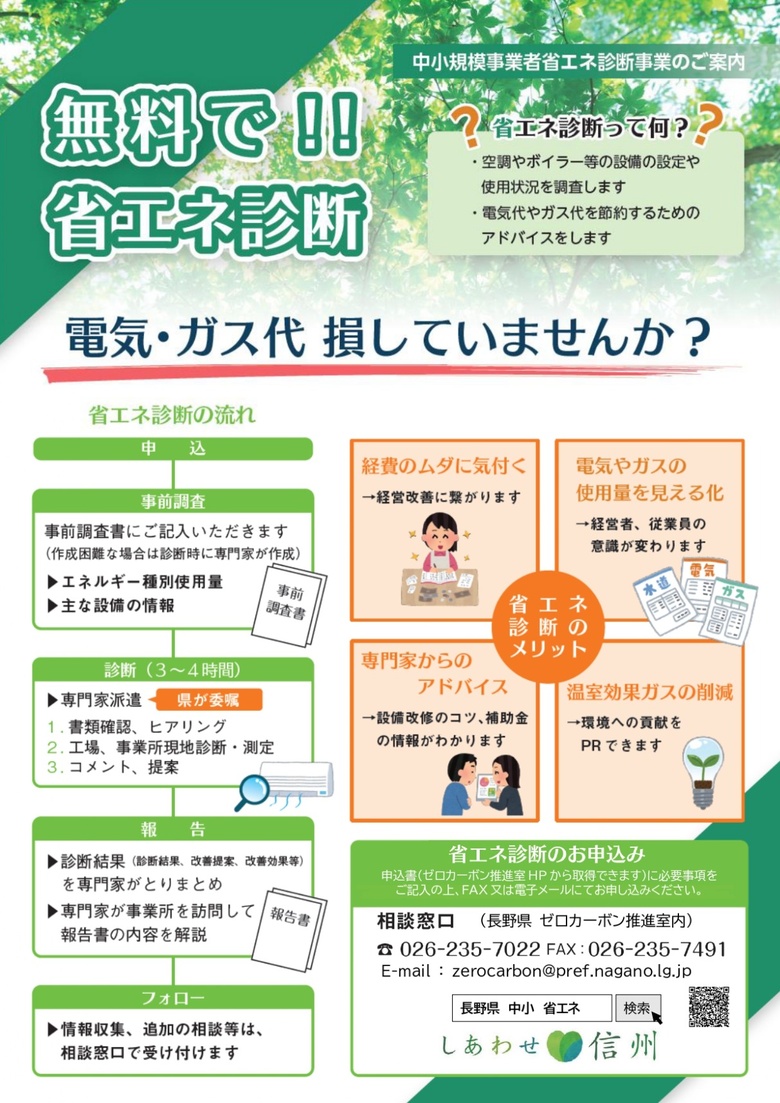 2022年05月18日(水) 中小規模事業者省エネ診断事業「無料で省エネ診断」のご案内 長野県環境政策課ゼロカーボン推進室より、中小規模事業者省エネ診断事業「無料で省エネ診断」のご案内です。 詳しくはこちらへ