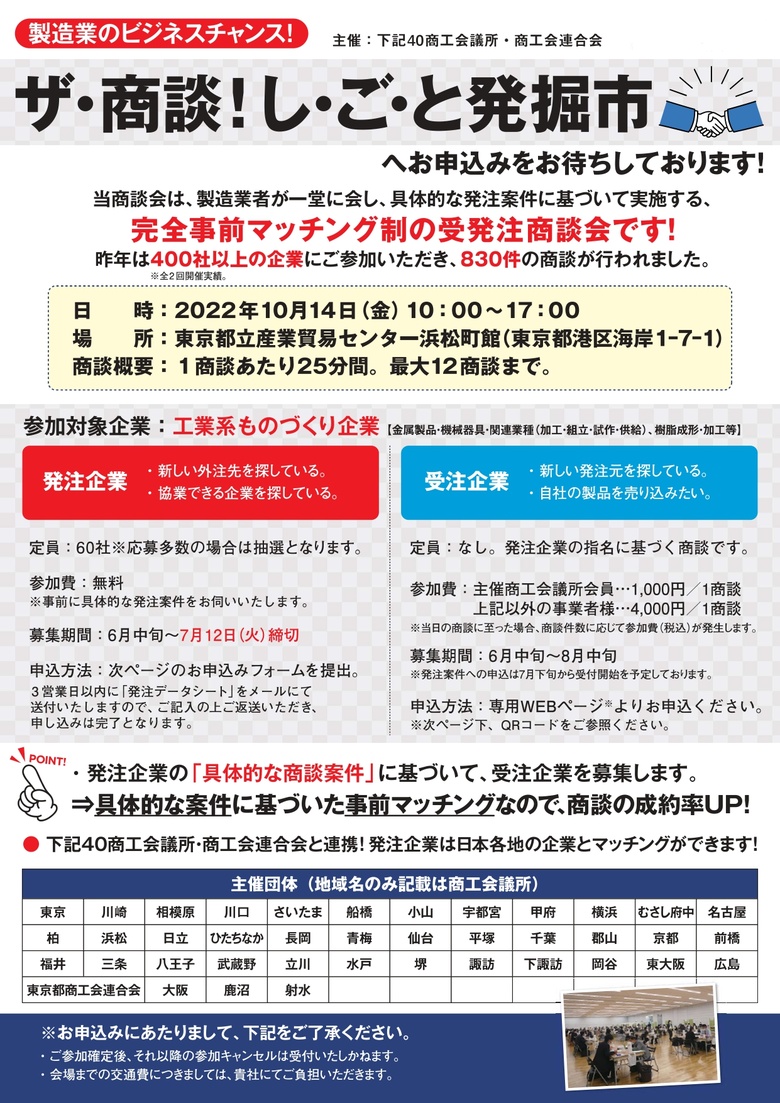 下諏訪商工会議所より、「ザ・商談!し・ご・と発掘市」出展社募集のご案内です。