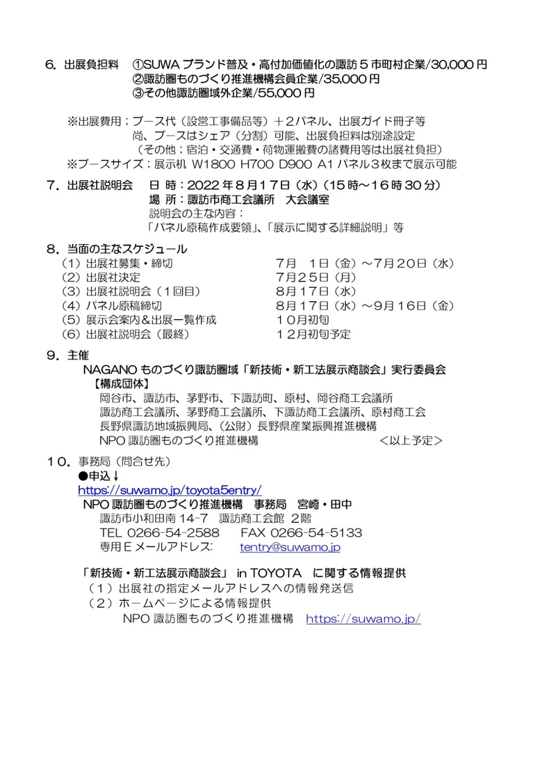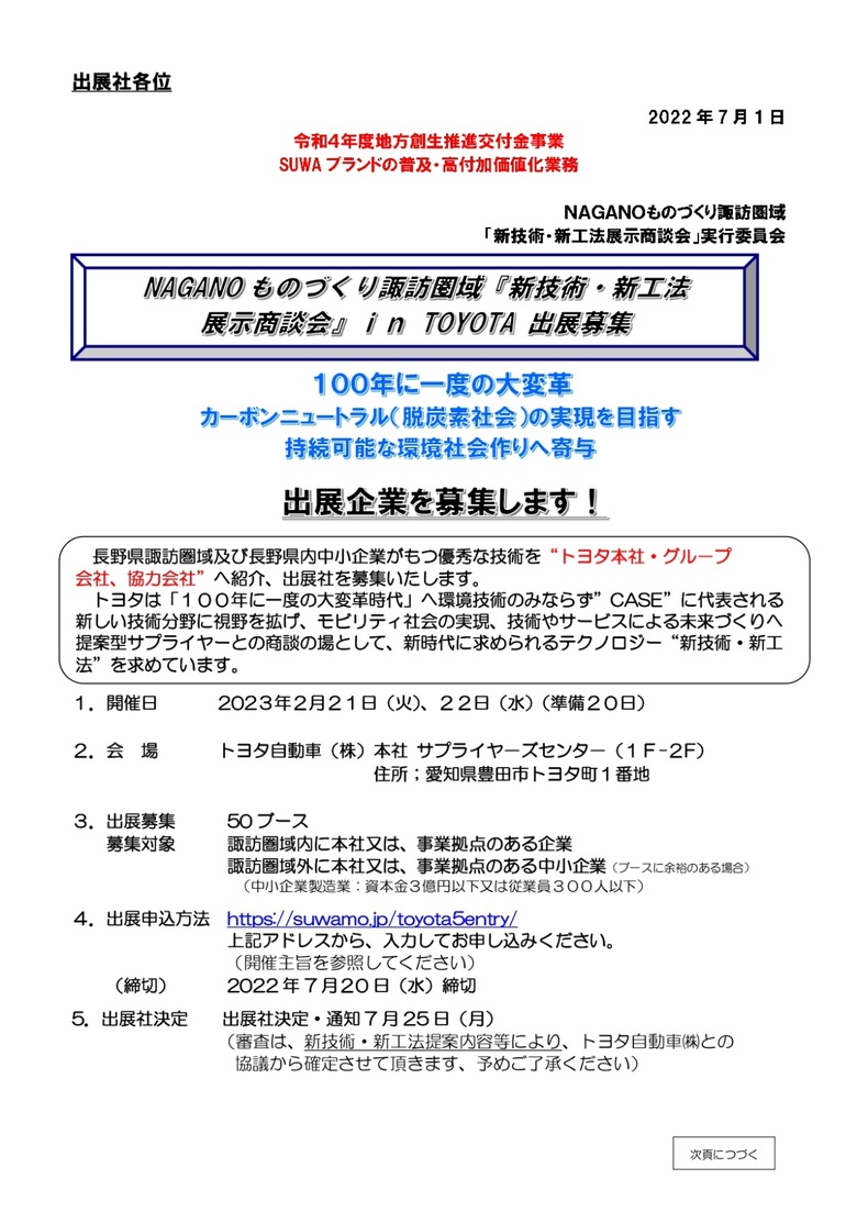 2022年07月08日(金) NAGANOものづくり諏訪圏域「新技術・新工法展示商談会」in TOYOTA出展社募集のご案内 諏訪圏ものづくり推進機構より、NAGANOものづくり諏訪圏域「新技術・新工法展示商談会」in TOYOTA出展社募集のご案内です。 詳しくはこちらへ