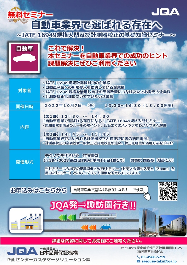 2022年09月07日(水) IATF116949規格入門及び計測器更正の基礎知識セミナーのご案内 日本品質保証機構より、自動車業界で選ばれる存在へ「IATF16949規格入門及び計測器更正の基礎知識セミナー」参加者募集のご案内です。 詳しくはこちらへ