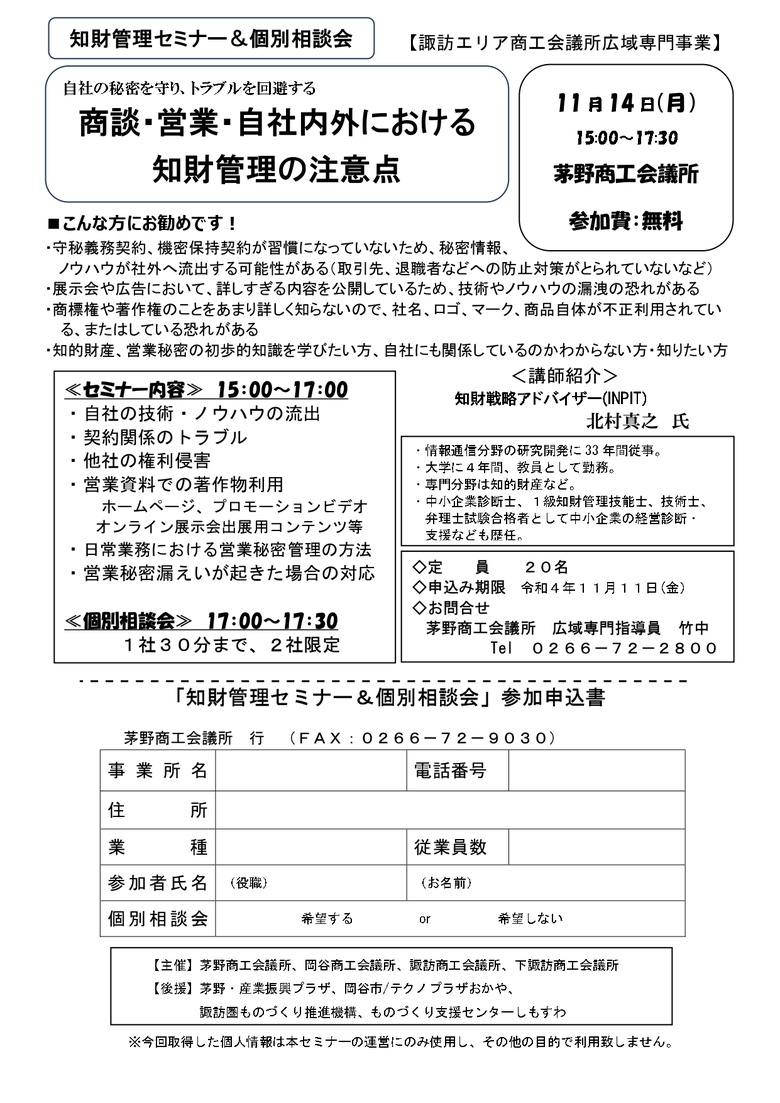 下諏訪商工会議所より、知財管理セミナー&個別相談会「商談・営業・自社内外における知財管理の注意点」参加者募集のご案内です。