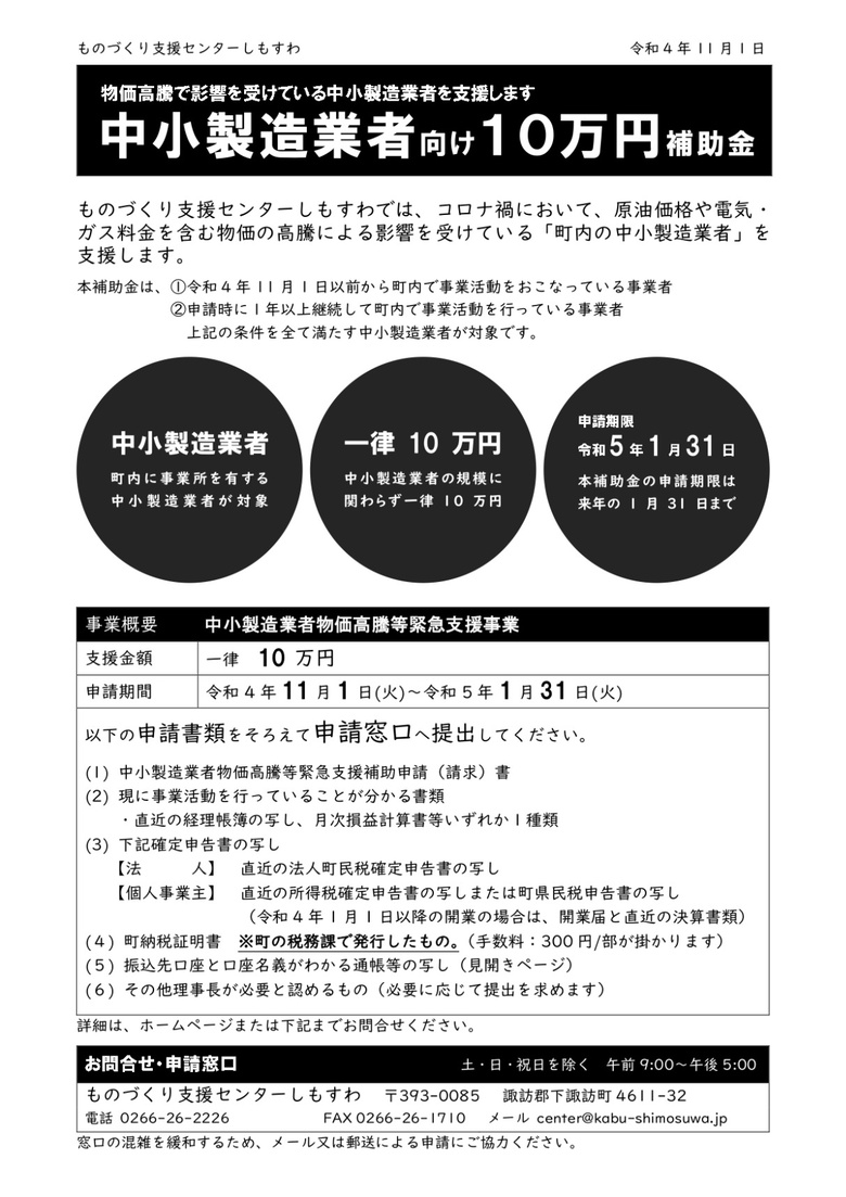 ものづくり支援センターしもすわでは、コロナ禍において、原油価格や電気・ガス料金を含む物価の高騰による影響を受けている「町内の中小製造業者」を支援します。