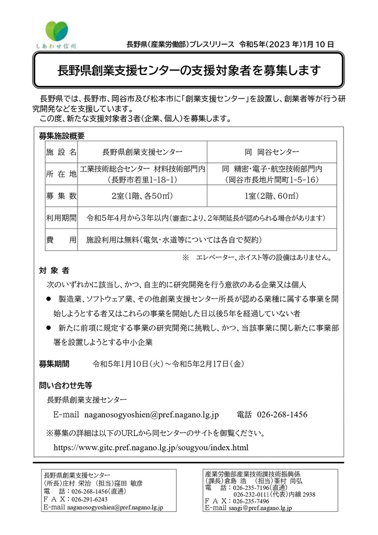 長野県創業支援センターより、 創業支援センター支援対象者募集のご案内です。