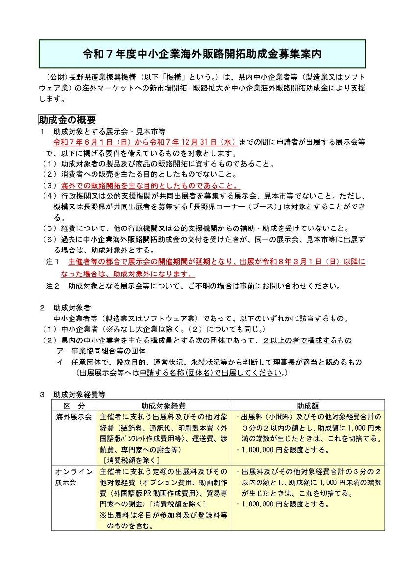 (公財)長野県産業振興機構(以下「機構」という。)は、県内中小企業者等(製造業又はソフトウェア業)の海外マーケットへの新市場開拓・販路拡大を中小企業海外販路開拓助成金により支援します。