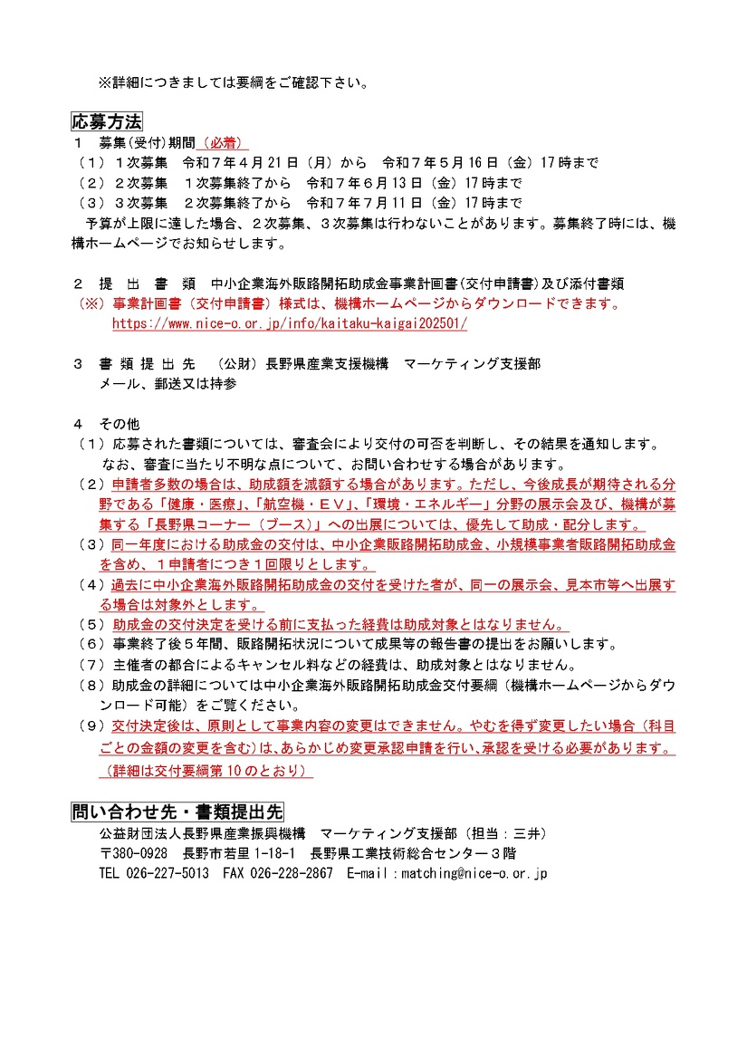 (2)申請者多数の場合は、助成額を減額する場合があります。ただし、今後成長が期待される分野である「健康・医療」、「航空機・EV」、「環境・エネルギー」分野の展示会及び、機構が募集する「長野県コーナー(ブース)」への出展については、優先して助成・配分します。