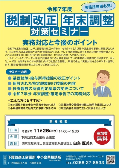 下諏訪商工会議所より①「中小企業におけるIT、DX化及びAIの活用について」研修会②「令和7年度 税制改正 年末調整対策セミナー」のお知らせ