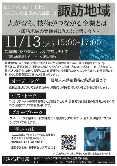 長野県より「私のアクション!未来のNAGANO創造県民会議in諏訪地域 人が育ち、技術がつながる企業とは~諏訪地域の実践者とみんなで語り合う~」のご案内