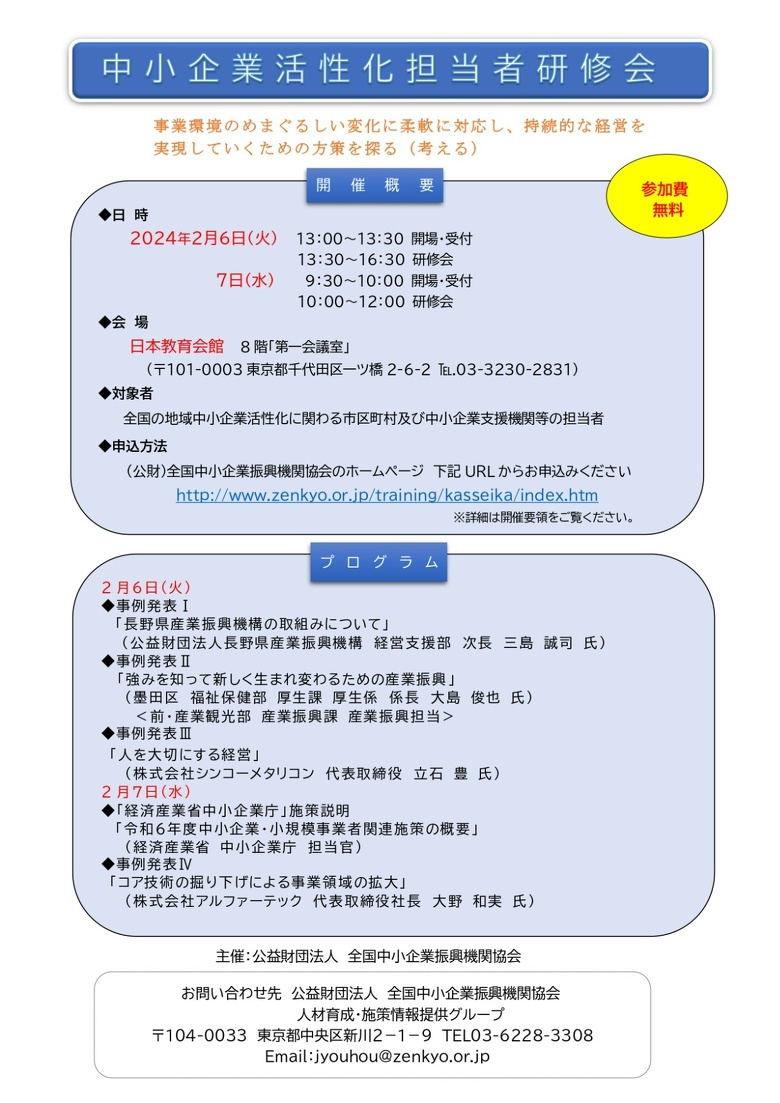 公益財団法人 全国中小企業振興機関協会より「中小企業活性化担当者研修会」受講者募集のご案内です。
