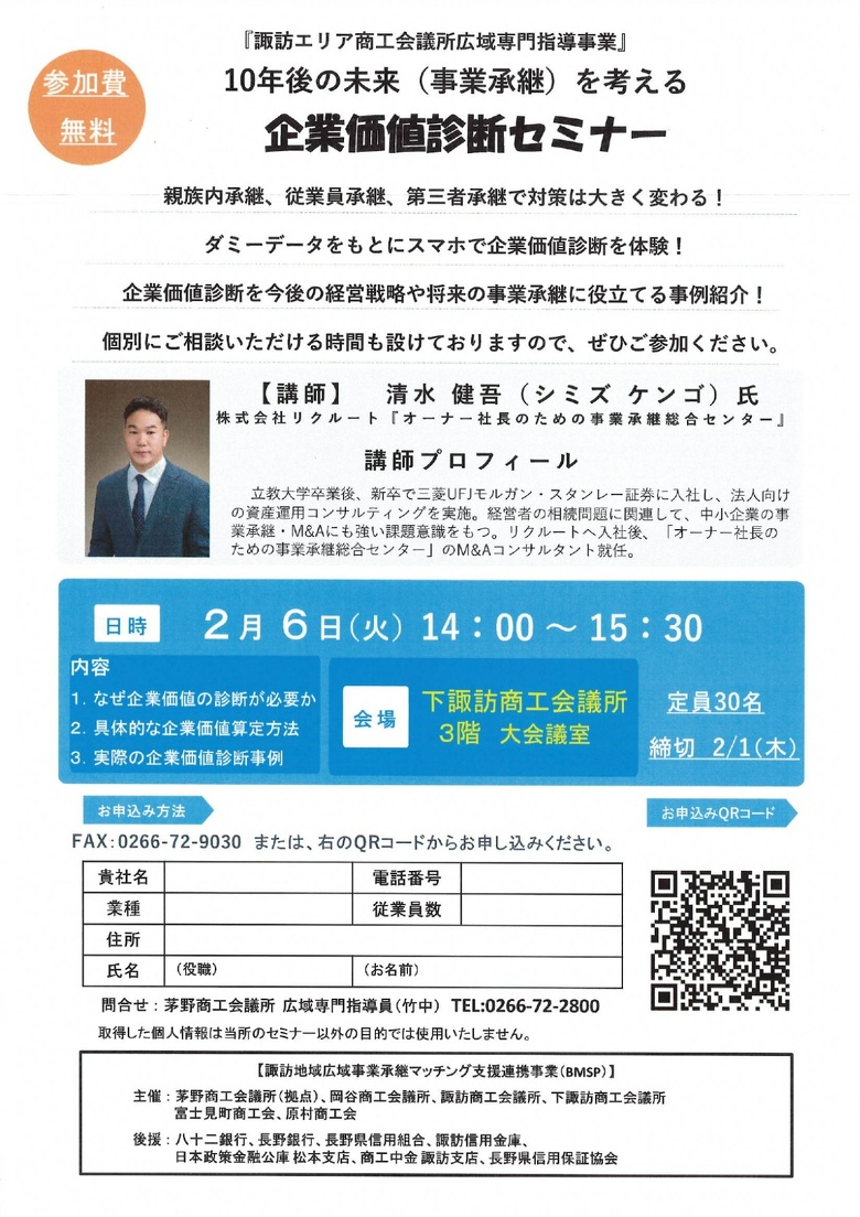 下諏訪商工会議所より「10年後の未来(事業承継)を考える 企業価値診断セミナー」のご案内です。