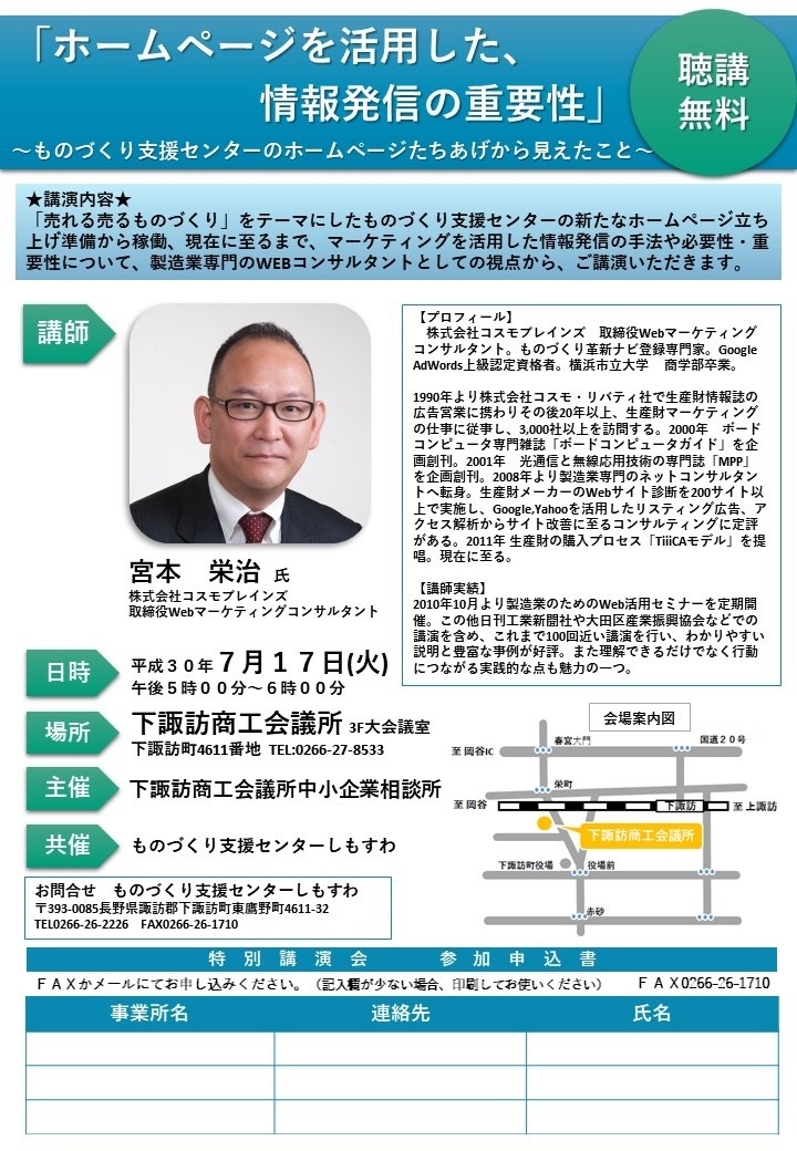 ものづくり支援センターしもすわでは、事業報告会に併せて特別講演会を開催致します。