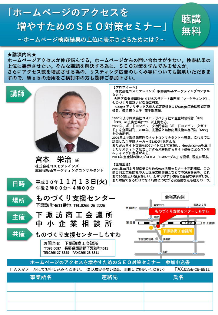 2018年10月31日(水) SEO対策セミナーのご案内 下諏訪商工会議所中小企業相談所より、ホームページのアクセスを増やすためのSEO対策セミナーのご案内です。 ページ右上の「お問合せ」よりお申込ください