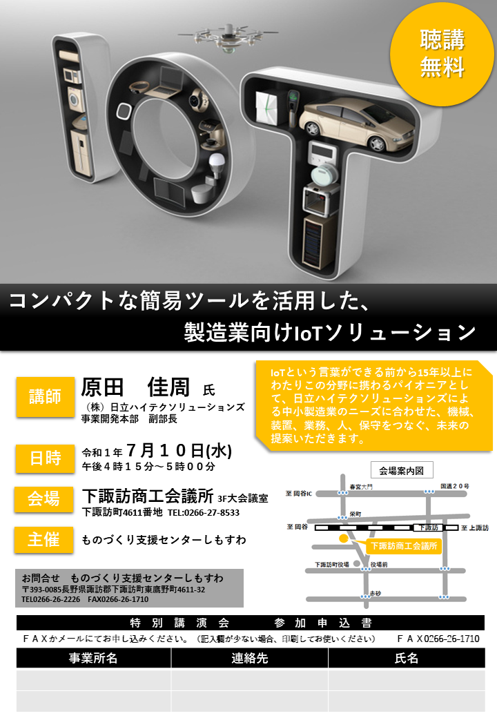 2019年06月28日(金) ものづくり支援センターしもすわ特別講演会のご案内 ものづくり支援センターしもすわ主催特別講演会のご案内です。 お申込みにつきましては、右上お問合せタグよりご連絡くださいますようお願い致します。