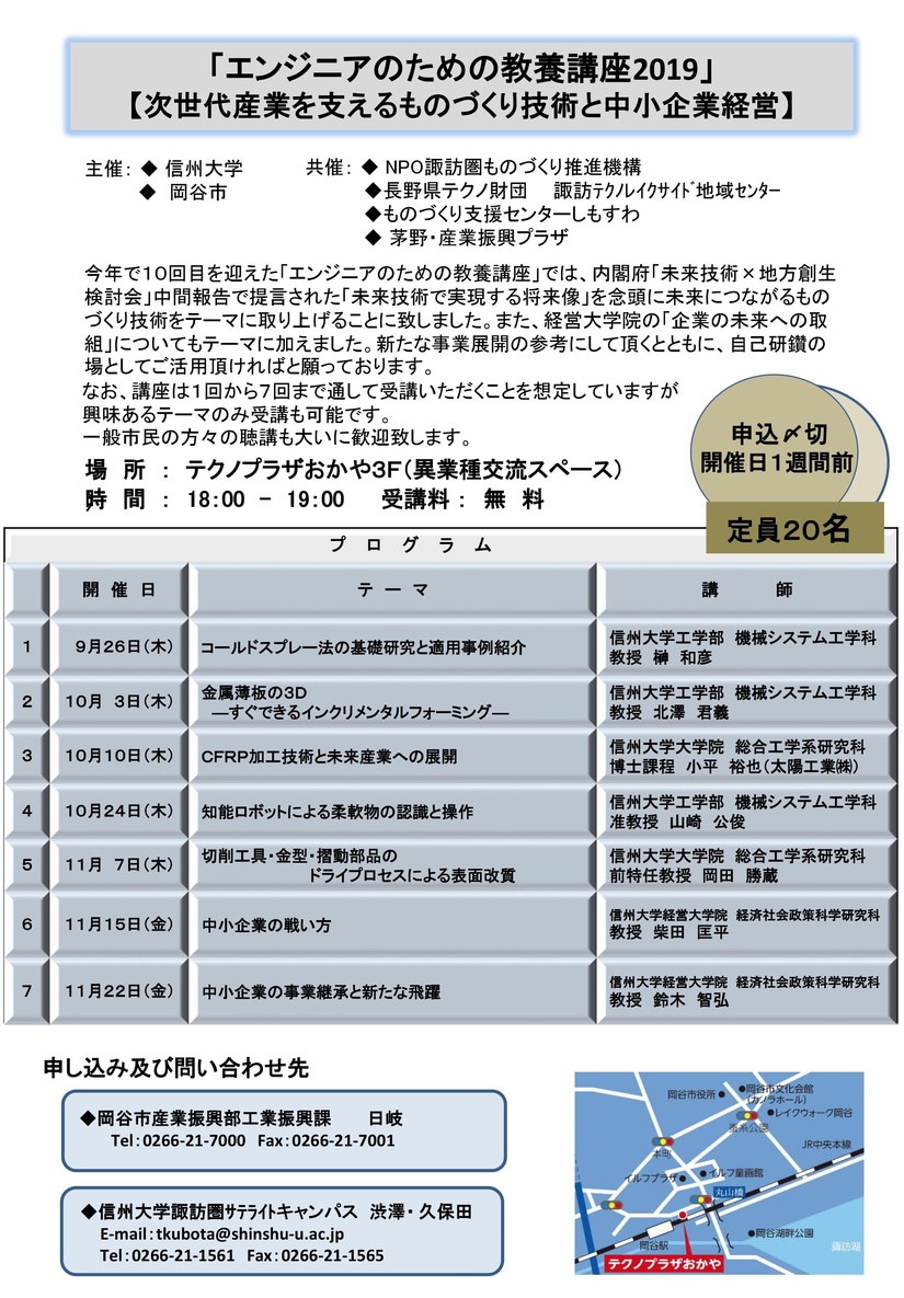 信州大学諏訪圏サテライトキャンパスより、「エンジニアのための教養講座2019」受講者募集のご案内です。