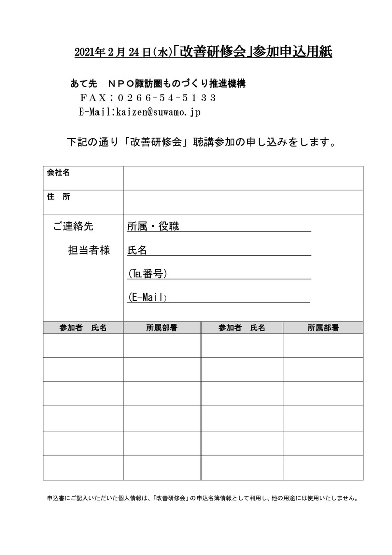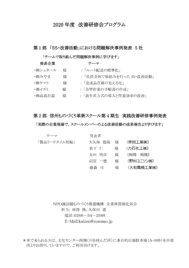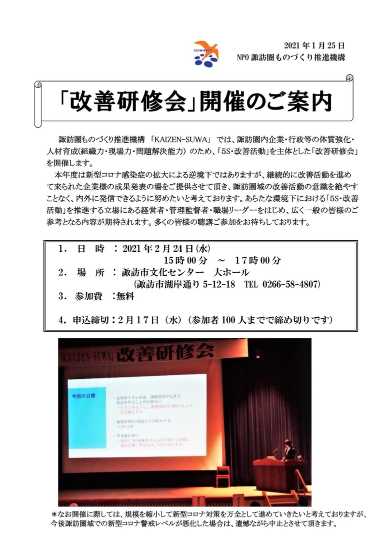 諏訪圏ものづくり推進機構より「改善研修会」開催のご案内です。