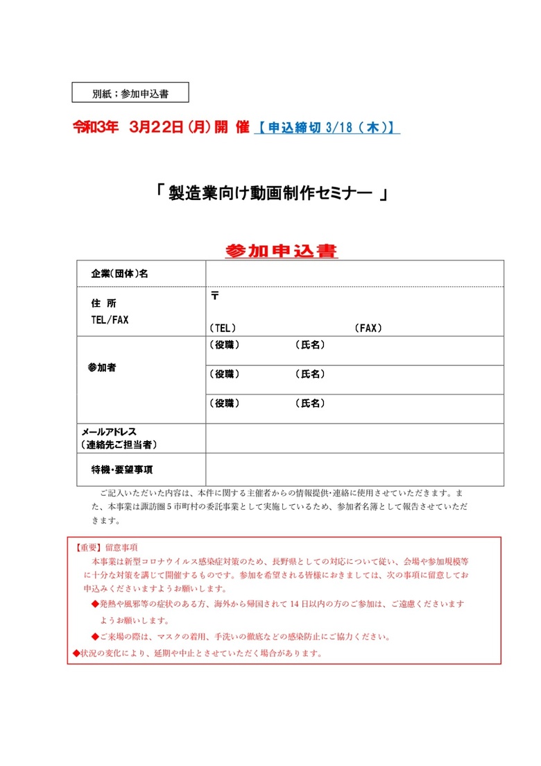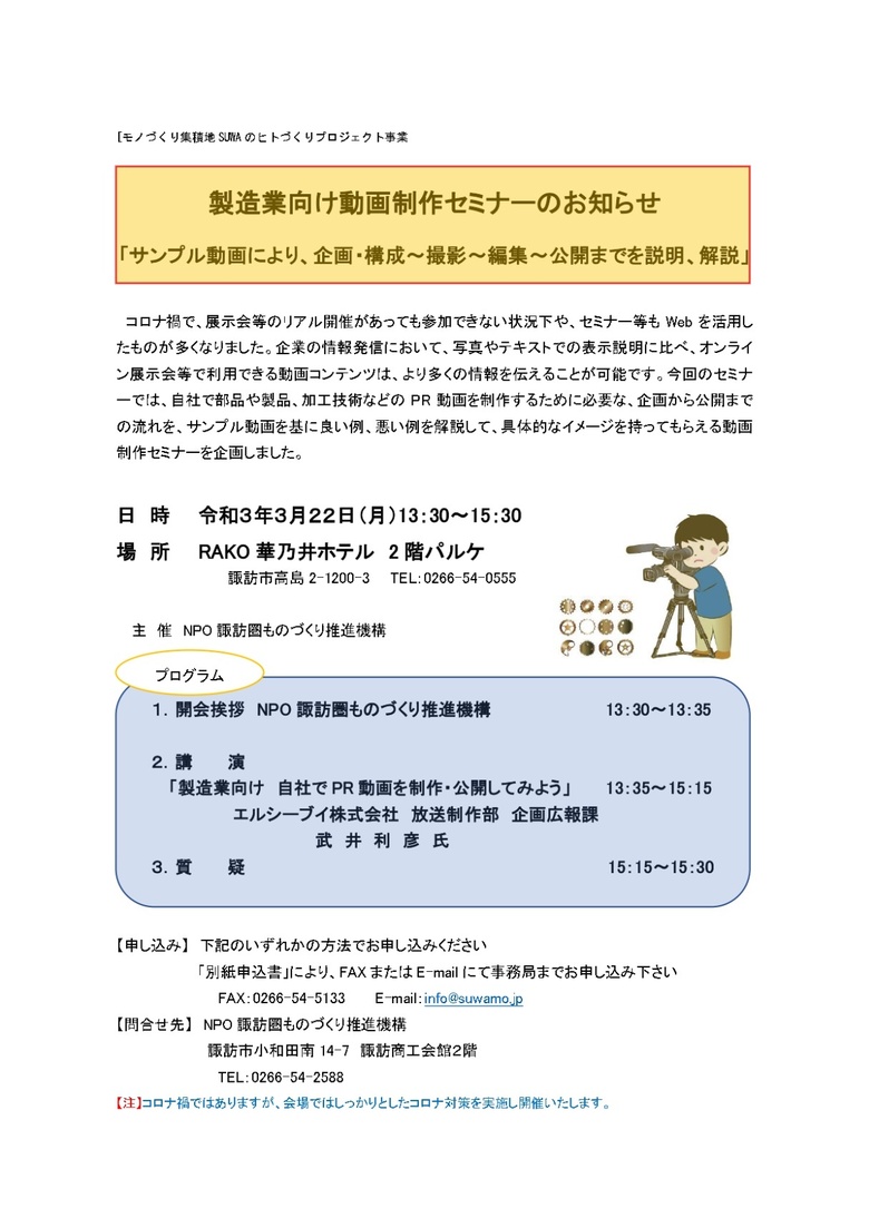 諏訪圏ものづくり推進機構より、「製造業向け動画制作セミナー」のご案内です。