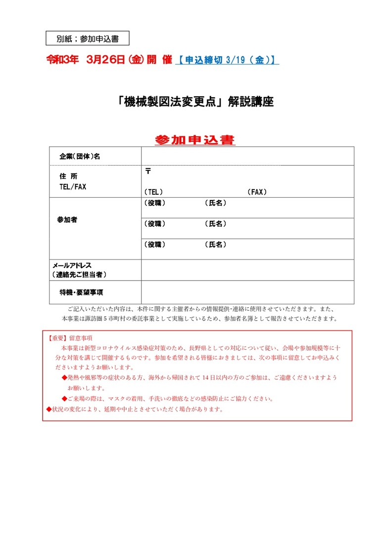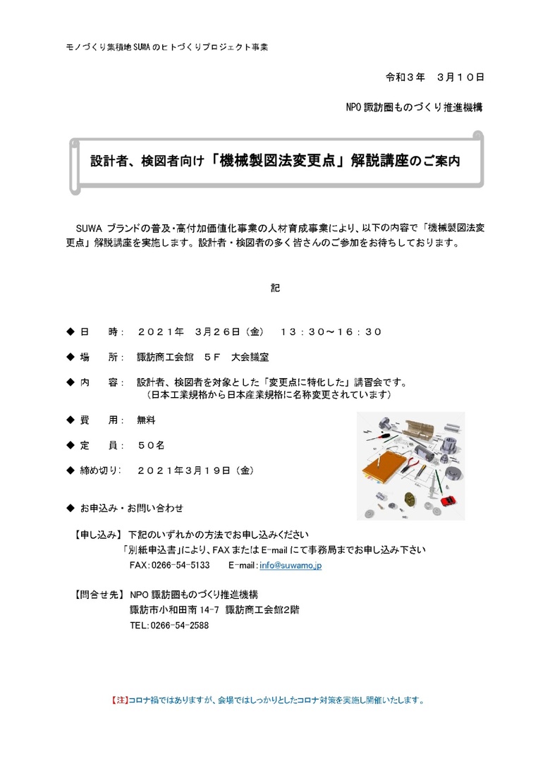 諏訪圏ものづくり推進機構より、「機械製図法変更点解説講座」のご案内です。